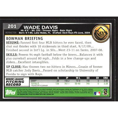 This is a 2010 Bowman Chrome Refractors Wade Davis baseball card. The card is #201 and pictures show condition. Team(s): Tampa Bay Rays Rookie Card (RC)