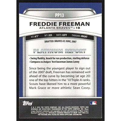 This is a 2010 Bowman Platinum Prospects Freddie Freeman baseball card. The card is #PP13 and pictures show condition.