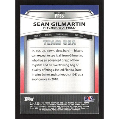 This is a 2010 Bowman Platinum Prospects Purple Refractors Sean Gilmartin autographed baseball card. This card has been signed, in blue, by Sean Gilmartin, and is guaranteed authentic by Ballcardz.com. The card is #PP36 and pictures show condition.
