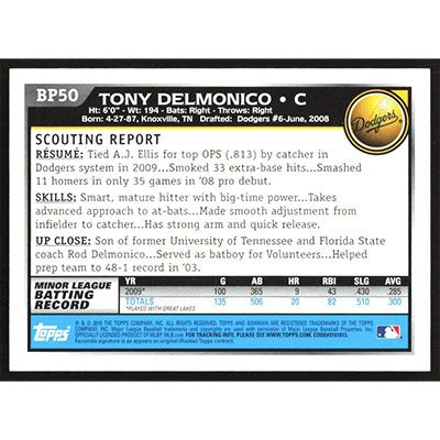 This is a 2010 Bowman Prospects Black Tony Delmonico autographed baseball card. This card has been signed, in blue, by Tony Delmonico, and is guaranteed authentic by Ballcardz.com. The card is #BP50 and pictures show condition.