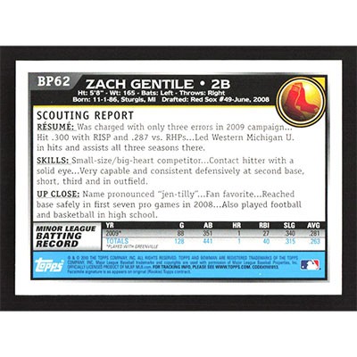 This is a 2010 Bowman Prospects Zach Gentile baseball card. The card is #BP62 and pictures show condition.