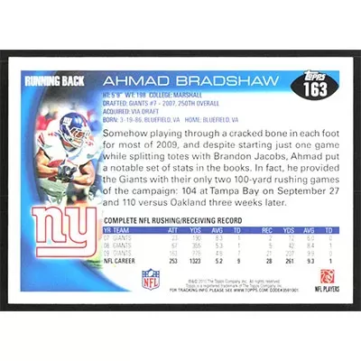 This is a 2010 Topps Ahmad Bradshaw football card. The card is #163 and pictures show condition.