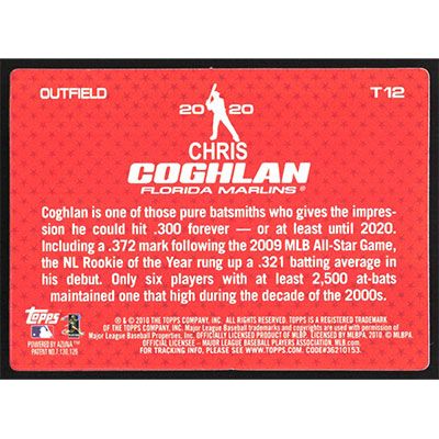 This is a 2010 Topps 2020 Chris Coghlan baseball card. The card is #T12 and pictures show condition.