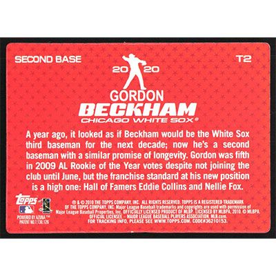 This is a 2010 Topps 2020 Gordon Beckham baseball card. The card is #T2 and pictures show condition.
