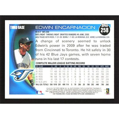 This is a 2010 Topps Edwin Encarnacion baseball card. The card is #258 and pictures show condition.