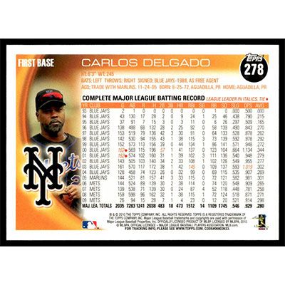 This is a 2010 Topps Carlos Delgado baseball card. The card is #278 and pictures show condition.