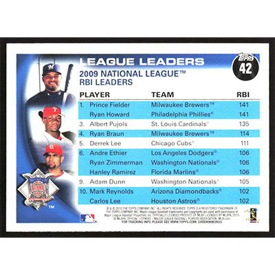 This is a 2010 Topps Prince Fielder, Ryan Howard and Albert Pujols League Leaders baseball card. The card is #42 and pictures show condition. Team(s): Milwaukee Brewers/Philadelphia Phillies/St. Louis Cardinals