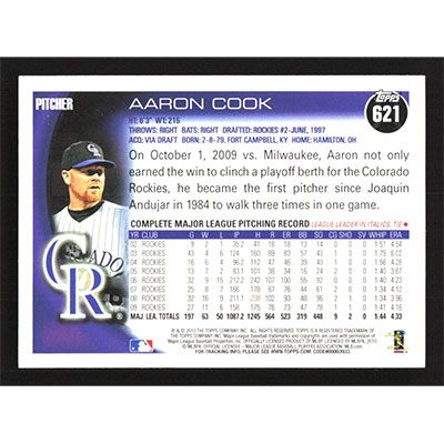 This is a 2010 Topps Aaron Cook baseball card. The card is #621 and pictures show condition.