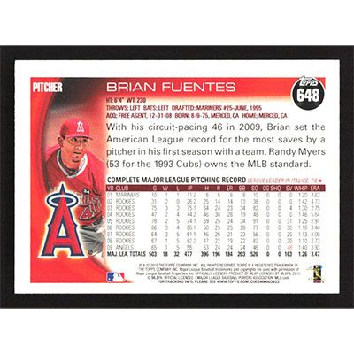 This is a 2010 Topps Brian Fuentes baseball card. The card is #648 and pictures show condition.
