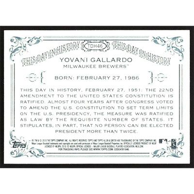 This is a 2010 Topps Allen & Ginter This Day in History Yovani Gallardo baseball card. The card is #TDH46 and pictures show condition. Team(s): Milwaukee Brewers