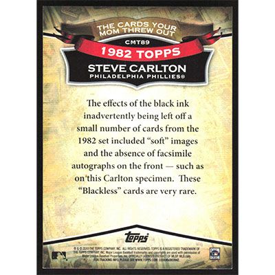 This is a 2010 Topps Cards Your Mom Threw Out 1982 Steve Carlton baseball card. The card is #CMT89 and pictures show condition. Team(s): Philadelphia Phillies