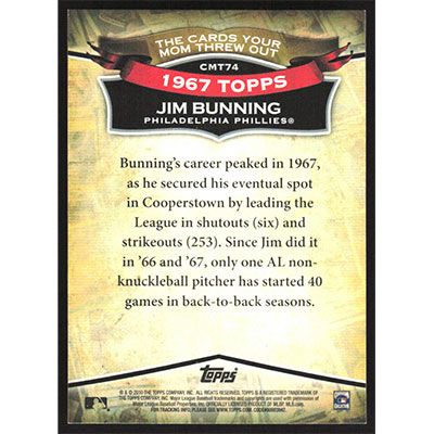 This is a 2010 Topps Cards Your Mom Threw Out Jim Bunning 1967 baseball card. The card is #CMT74 and pictures show condition. Team(s): Philadelphia Phillies