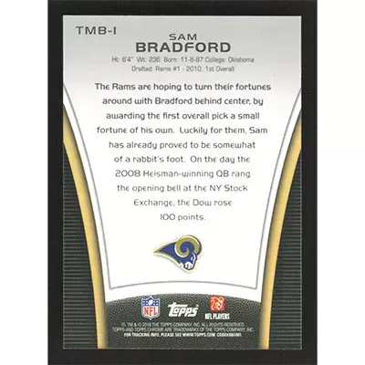 This is a 2010 Topps Chrome Retail Exclusive Rookie Refractors Sam Bradford football card. The card is #TMB-1 and pictures show condition. Team: St. Louis Rams Rookie Card