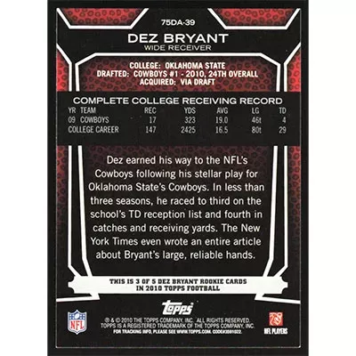 This is a 2010 Topps Draft 75th Anniversary Dez Bryant football card. The card is #75DA-39 and pictures show condition.