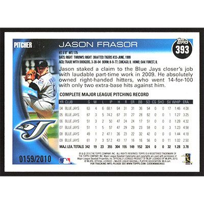 This is a 2010 Topps Gold Jason Frasor baseball card. The card is #393 and pictures show condition. This card is limited; #'d 0159/2010. Team(s): Toronto Blue Jays