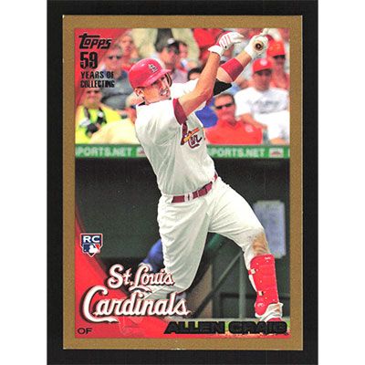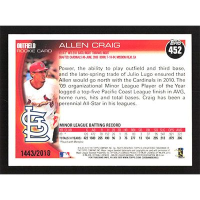 This is a 2010 Topps Gold Allen Craig baseball card. The card is #452 and pictures show condition. This card is limited; #'d 1443/2010. Team(s): St. Louis Cardinals Rookie Card (RC)