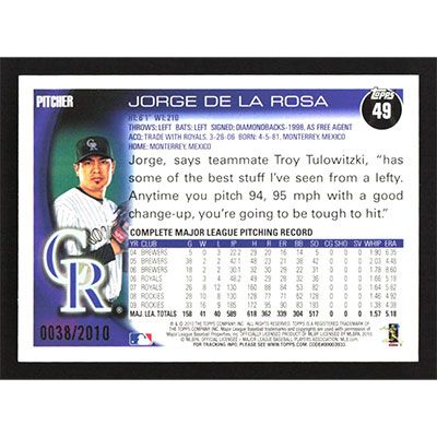 This is a 2010 Topps Gold Jorge De La Rosa baseball card. The card is #49 and pictures show condition. This card is limited; #'d 0038/2010. Team(s): Colorado Rockies