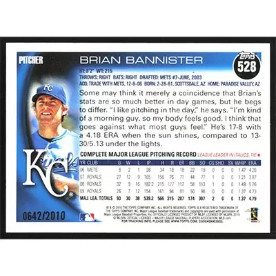 This is a 2010 Topps Gold Brian Bannister baseball card. The card is #528 and pictures show condition. This card is limited; #'d 0642/2010. Team(s): Kansas City Royals