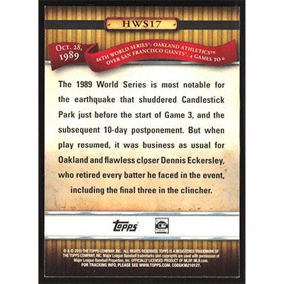 This is a 2010 Topps History of the World Series Dennis Eckersley baseball card. The card is #HWS17 and pictures show condition. Team(s): Oakland Athletics