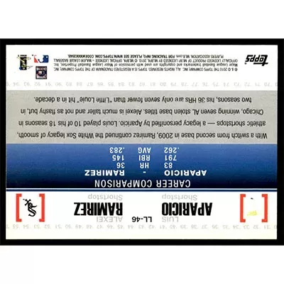 This is a 2010 Topps Legendary Lineage Luis Aparicio and Alexei Ramirez baseball card. The card is #LL-46 and pictures show condition. Team(s): Chicago White Sox