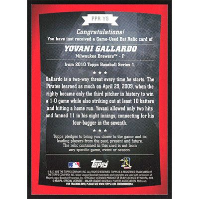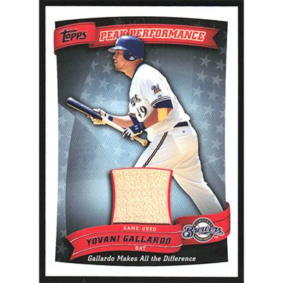 This is a 2010 Topps Peak Performance Relics Yovani Gallardo Bat baseball card. The card is #PPR-YG and pictures show condition. Team(s): Milwaukee Brewers