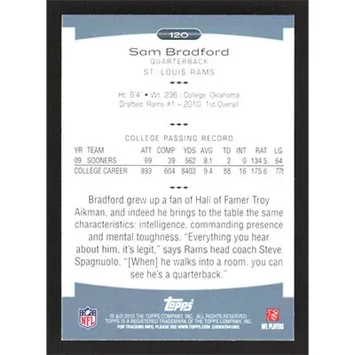 This is a 2010 Topps Platinum Sam Bradford football card. The card is #120 and pictures show condition.