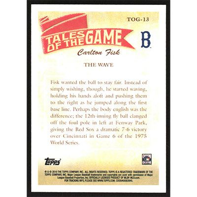 This is a 2010 Topps Tales of the Game Carlton Fisk The Wave baseball card. The card is #TOG-13 and pictures show condition.