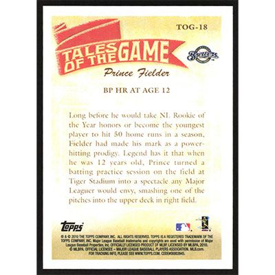 This is a 2010 Topps Tales of the Game Prince Fielder Prince: BP HR at Age 12 baseball card. The card is #TOG-18 and pictures show condition. Team(s): Milwaukee Brewers