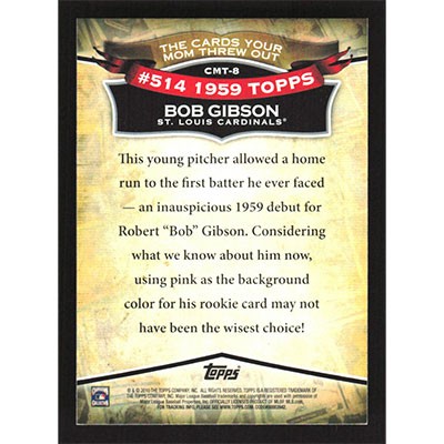This is a 2010 Topps The Cards Your Mom Threw Out Bob Gibson 1959 baseball card. The card is #CMT-8 and pictures show condition. Team(s): St. Louis Cardinals