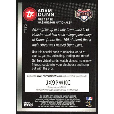 This is a 2010 Topps Topps Town Adam Dunn baseball card. The card is #TTT21 and pictures show condition.