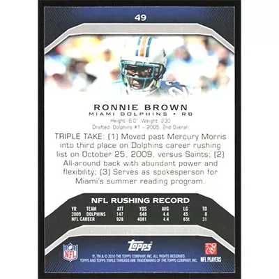 This is a 2010 Topps Triple Threads Ronnie Brown football card. The card is #49 and pictures show condition. This card is limited; #'d 0850/1350. Team: Miami Dolphins