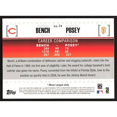 This is a 2010 Topps Update Legendary Lineage Johnny Bench and Buster Posey baseball card. The card is #LL-74 and pictures show condition. Team(s): Cincinnati Reds/San Francisco Giants