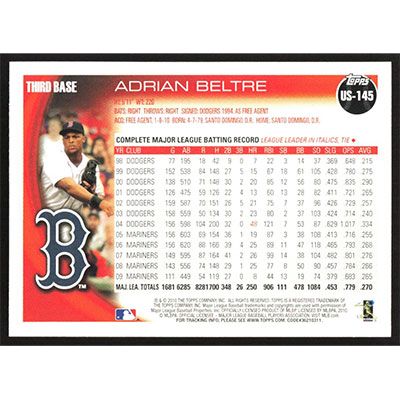 This is a 2010 Topps Update Adrian Beltre baseball card. The card is #US-145 and pictures show condition.