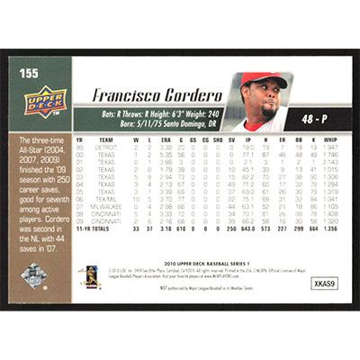 This is a 2010 Upper Deck Francisco Cordero baseball card. The card is #155 and pictures show condition.
