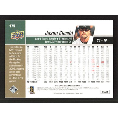 This is a 2010 Upper Deck Jason Giambi baseball card. The card is #175 and pictures show condition.