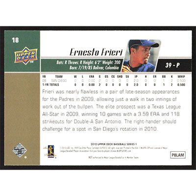 This is a 2010 Upper Deck Ernesto Frieri baseball card. The card is #18 and pictures show condition.