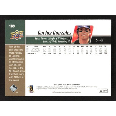This is a 2010 Upper Deck Carlos Gonzalez baseball card. The card is #189 and pictures show condition.