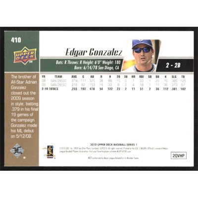 This is a 2010 Upper Deck Edgar Gonzalez baseball card. The card is #410 and pictures show condition.