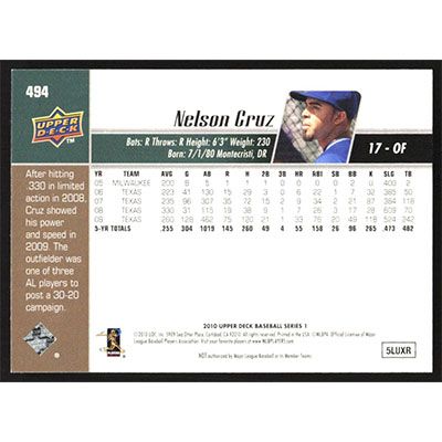 This is a 2010 Upper Deck Nelson Cruz baseball card. The card is #494 and pictures show condition.