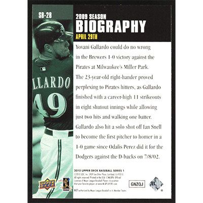 This is a 2010 Upper Deck Season Biography Yovani Gallardo baseball card. The card is #SB-28 and pictures show condition.