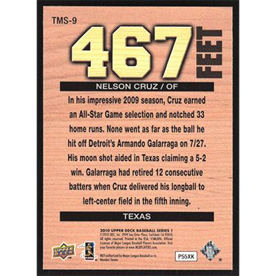 This is a 2010 Upper Deck Tape Measure Shots Nelson Cruz baseball card. The card is #TMS-9 and pictures show condition.