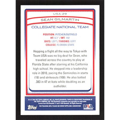 This is a 2010 USA Baseball Sean Gilmartin autographed baseball card. This card has been signed, in blue, by Sean Gilmartin, and is guaranteed authentic by Ballcardz.com. The card is #USA-29 and pictures show condition.