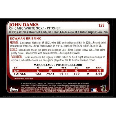 This is a 2011 Bowman John Danks baseball card. The card is #123 and pictures show condition.