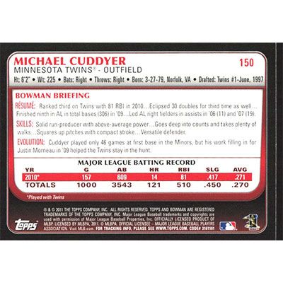 This is a 2011 Bowman Michael Cuddyer baseball card. The card is #150 and pictures show condition.