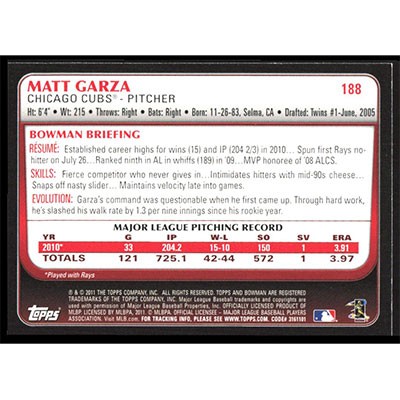 This is a 2011 Bowman Matt Garza baseball card. The card is #188 and pictures show condition.