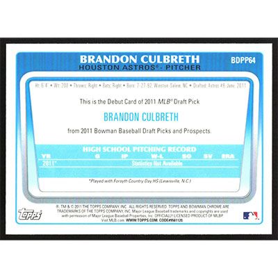 This is a 2011 Bowman Chrome Draft Prospects Brandon Culbreth baseball card. The card is #BDPP64 and pictures show condition.