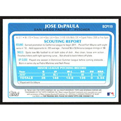This is a 2011 Bowman Chrome Prospects Jose DePaula baseball card. The card is #BCP119 and pictures show condition.