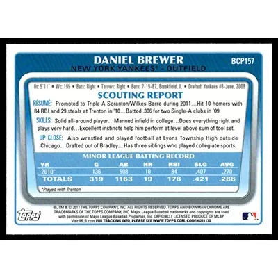 This is a 2011 Bowman Chrome Prospects Daniel Brewer autographed baseball card. This card has been signed, in blue, by Daniel Brewer, and is guaranteed authentic by Ballcardz.com. The card is #BCP157 and is in NM-MT condition.