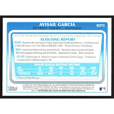 This is a 2011 Bowman Chrome Prospects Avisail Garcia baseball card. The card is #BCP72 and pictures show condition.