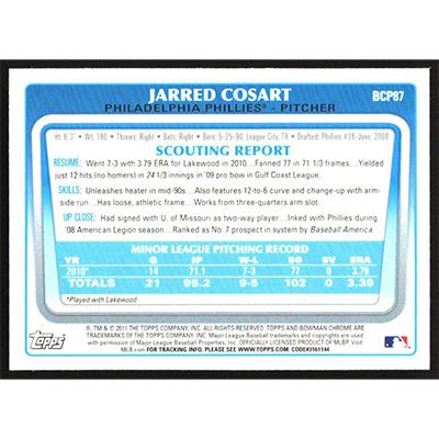 This is a 2011 Bowman Chrome Prospects Jarred Cosart baseball card. The card is #BCP87 and pictures show condition.